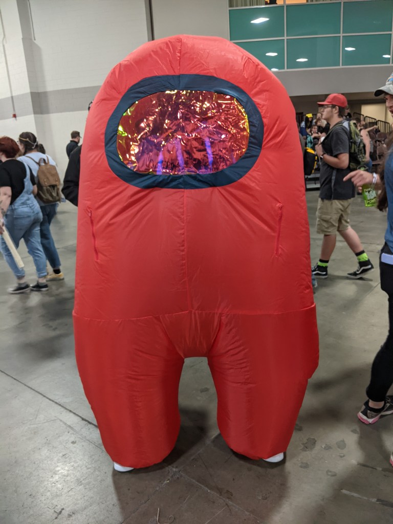 I never saw them together, but there were a bunch of Among Us costumes at the con.The androids are some of the most underused characters in DBZ. Seventeen and Eighteen especially. Not sure who that is on the right.